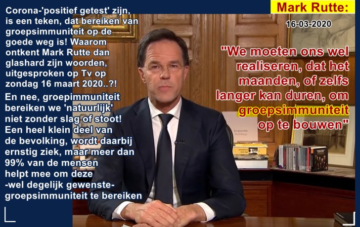 Premier Mark Rutte had er niet over gesproken zei hij in de Tweede Kamer, een paar weken geleden. Gewoon weer de RUTTE-LEUGENS, die we van hem gewend zijn. Maar dit keer zijn er 2 miljoen getuigen..! Want in zijn eerste toespraak aan het Nederlandse volk op 16 maart jl., inzake de Corona-ontwikkelingen, spreekt hij over.. (NATUURLIJKE) GROEPSIMMUNITEIT..! Wat is er nu aan de hand, dat hij deze woorden ontkent..?? Mag die natuurlijke groepsimmuniteit niet bereikt worden, omdat anders veel mensen besmet raken..?? Mag het vuur niet onder de ketel, als je water wilt koken, omdat het gevaar van een huishoudelijke brand té groot wordt geacht..??