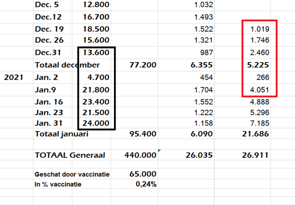 Ik heb geprobeerd ook voor Nederland zoiets op te stellen, maar dat is tot ultimo januari vrij zinloos. Het aantal coronadoden klopt niet, wat de overheid zelf aangeeft, want ze geven zelf aan, dat bv de doktoren niet hoeven aan te geven dat iemand door corona is gestorven. Betrouwbaarder zouden zijn de CBS cijfers zijn van oversterfte en dit is ook maar een schatting. Dus zoals gewoonlijk een puinhoop.